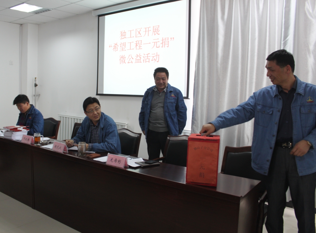 根據集團公司團委“希望工程1元捐”微公益活動(dòng)通知要求,獨工區團支部認真領(lǐng)會(huì )通知精神,積極召開(kāi)了宣傳動(dòng)員會(huì )議,組織工區團員青年、業(yè)務(wù)、管技人員開(kāi)展了 “希望工程1元捐”微公益活動(dòng),為希望工程奉獻愛(ài)的力量,為需要幫助的人們送去一份溫暖。