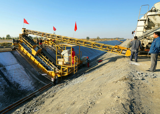 據了解,這套渠道混凝土襯砌機包括渠道混凝土墊層攤鋪機、渠道震動(dòng)滑膜襯砌機、收光機和切縫機四套設備。在正常施工情況下,渠道混凝土墊層攤鋪機每小時(shí)可以攤鋪50米,渠道震動(dòng)滑膜襯砌機每小時(shí)可以打混凝土10至12方,攤鋪距離15至18米,收光機隨后全部收光。攤鋪好的渠道保養合格后,再進(jìn)行切縫作業(yè)。